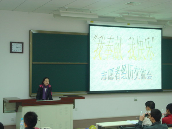 12月1日,在良乡校区理科教学楼202教室,软件学院分团委主办了主题为“我奉献 我快乐”的志愿者经历交流会。到场的嘉宾有6名来自各个领域的志愿者。他们分别是2007年上海特奥会志愿者黄霆;2007年“好运北京”国际盲人们求邀请赛志愿者郝鹏飞、史闯岭;2007年中国网球公开赛十佳志愿者王圣;2007年“好运北京”国际棒球邀请赛志愿者周光宇;造血干细胞捐献者之家的志愿者俞锦声。
