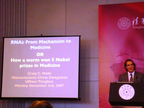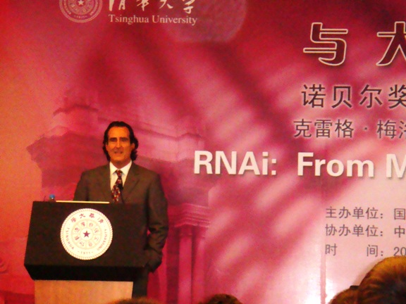 本次获得的主讲者克雷格.梅洛教授是2006年诺贝尔生理/医学奖获得者,是麻省大学医学院分子医学Blais教授和霍华德.休斯医学研究院研究员。1998年Mello与Fire首次发现双链RNA可以高效专一地沉默基因,成为近十年来最重要的科学发现之一,2002和2003年连续两年被《科学》评为十大科学突破,所以本次讲座的内容十分精彩,在学院的精心组织下,同学们积极参与。