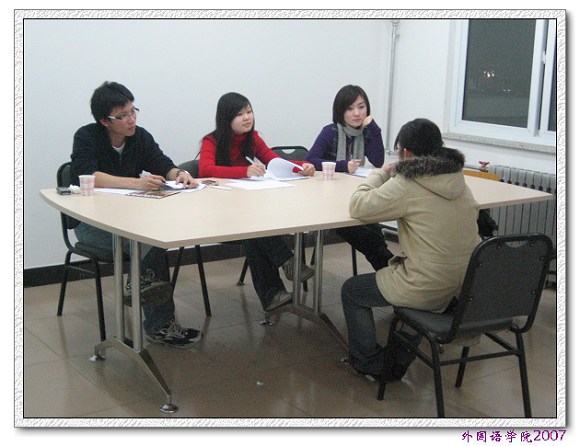 担任此次英语口语专业测试的评委是来自外国语学院中关村校区的高年级英语专业学长,他们用专业的技能,热情的态度,认真的评判;参加面试的同学们也都是充满信心和激情,很多同学很早就来到面试现场,积极准备。经过英语口语专业测试,外国语学院2007级选拔出20名同学参加了综合知识考试。