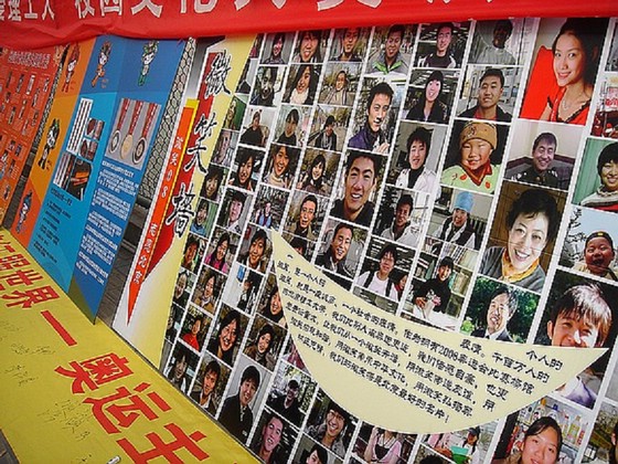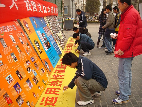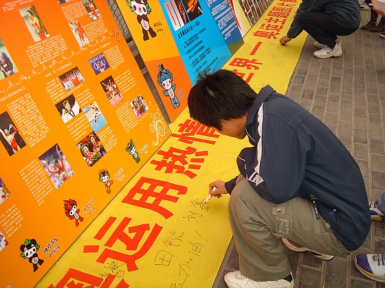 与微笑墙展出同时进行的还有在主题条幅上签名的活动。很多同学签下了自己的名字,还激动地写上“奥运加油”等话语。