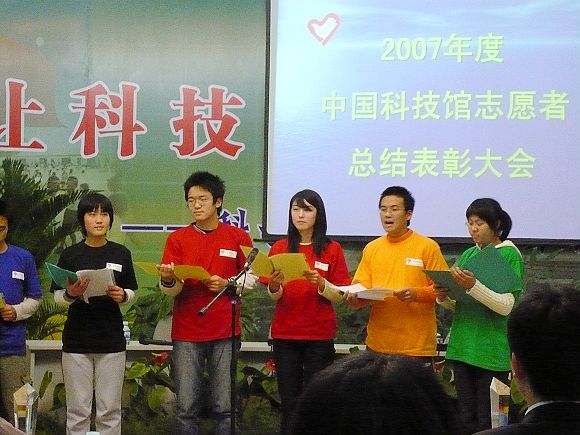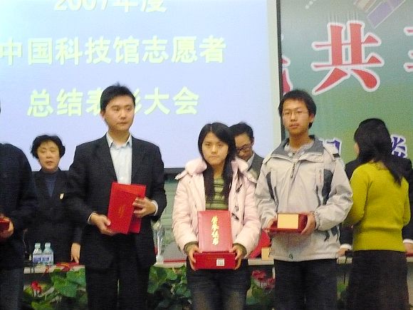 12月23日是中国科学技术馆2007年度志愿者表彰大会。出席会议的有馆方的工作人员以及ob真人理学院、ob真人宇航学院、北京科技大学、北京航空航天大学、北京城市大学、煤炭总医院、IBM等15所单位的志愿者代表。会上首先由中国科技馆张处长讲话,他首先对2007年志愿者的工作情况做了总结,并对科技馆志愿者以后的工作提出了要求。随后由志愿者负责人王霞老师详细报告2007年志愿者工作情况。在接下来的颁奖仪式上,理学院青协志愿者张林杰和徐伯辰被评为优秀志愿者。最后是志愿者代表发言和志愿者及工作人员风采展示。会上大家都表现出较高的热情,认真听取发言。同时会上馆方也对我们提出了下一年度的要求,并对我们寄予厚望。