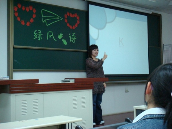本次“绿风手语”讲座邀请到了来自北京志愿者协会下属的鸿雁志愿者服务队的冯聪老师。讲台上,冯老师声情并茂的向大家传授着手语的各种动作。讲台下,大家也都随着老师一起舞动起自己的手指。