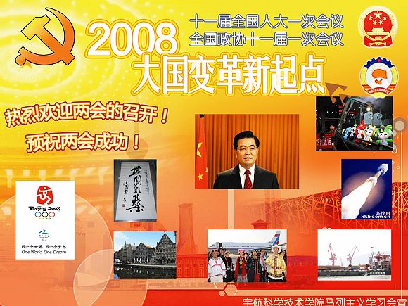2008年对于我们中国人来说是不同寻常的一年,今年不但是我们的奥运年,还是纪念改革开放30周年。三月的北京,春风暖人,我国全国政协十一届一次会议以及十一届全国人大一次会议分别于3月3日、3月5日在人民大会堂隆重开幕。为了让全体同学关注“两会”,关注时事,我们特在三号教学楼的宣传栏挂起了两会的宣传海报,在呼吁大家积极关注我国的未来发展之路的同时,还为同学们传递最新的“两会”动态,为广大同学了解“两会”,认识“两会”提供了平台!