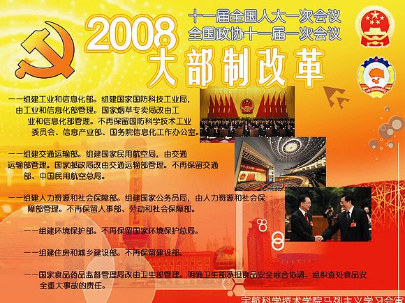 本次“两会”的看点除大家一直关切的经济民生,生态环境,外交国防,台海奥运等问题外,最受瞩目的莫属大部制改革和国家领导人换届的议题了。国务院机构改革方案如下:组建工业和信息化部,不保留国防科工委和信产部;组建交通运输部,不保留交通部、中国民用航空总局,保留铁道部;组建人力资源和社会保障部,不保留人事部、劳动和社会保障部;组建环境保护部,不保留环保总局;组建住房和城乡建设部,不保留建设部。改革后,除国务院办公厅外,国务院组成部门设置27个。