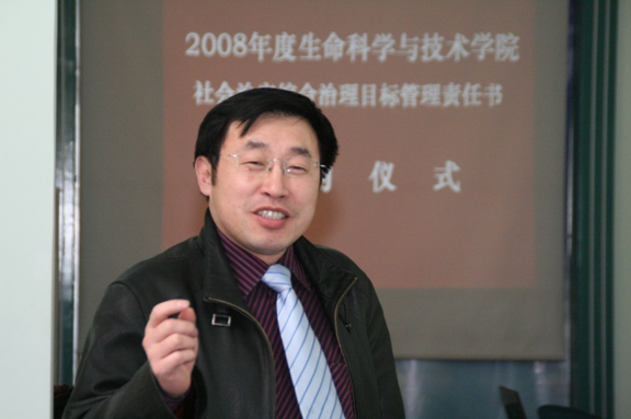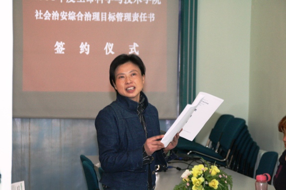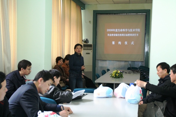 4月2日,生命科学与技术学院在求是楼二层会议室,举行了2008年社会治安综合治理目标责任书签约仪式,仪式由生命学院唐晓英副院长主持,生命学院邓玉林院长、李兰东书记、庞思平副院长和周连景副书记、副院长出席仪式,来自学院各系所、中心的负责人参加大会并签署责任书,各实验室的安全责任人也参加了本次会议。