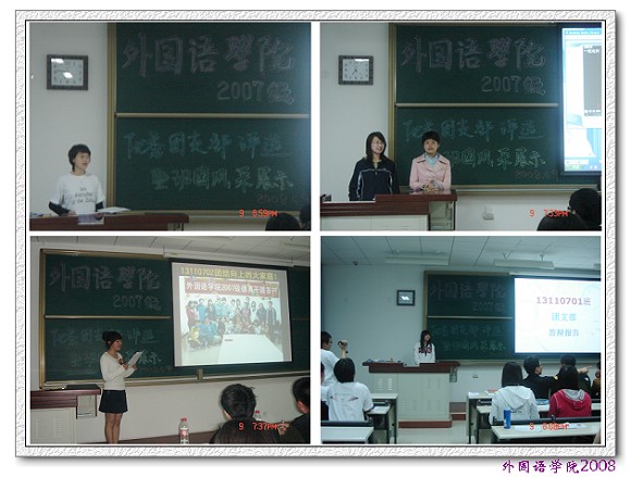 4月9日晚外国语学院2007级班团风采展示在良乡校区理科教学楼召开,宇航学院徐莹莹老师,机车学院李文彪老师,理学院闫磊老师,外国语学院班主任栗卓老师,外国语学院张磊老师出席展示活动并担任班团风采展示的评委,外国语学院2007级全体学生参加展示。