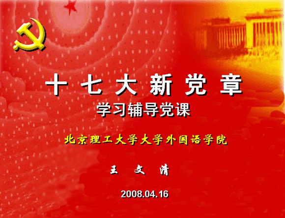 王文清书记介绍了从中国共产党成立开始到现在,共有十五部党章,四大党章体系,由中共一大,依次介绍各次代表大会上所颁布的纲领、章程以及对党章所进行的修改,同时也是对中华民族,对党的历史一个回顾的过程。王书记分十五个部分介绍十七大对党章进行的修改方面,具体到中国共产党章程的每一个部分,每一页内容。是继上次党课概括了解后的一次详细学习,加深了同学们对党章的了解与认知。之后,王书记分健全党员标准、保持党员先进性和坚持健全民主集中制两个部分讲解了十七大党章的重点内容,使同学们更加明确身为党员的意义与义务。