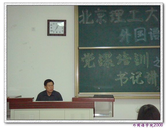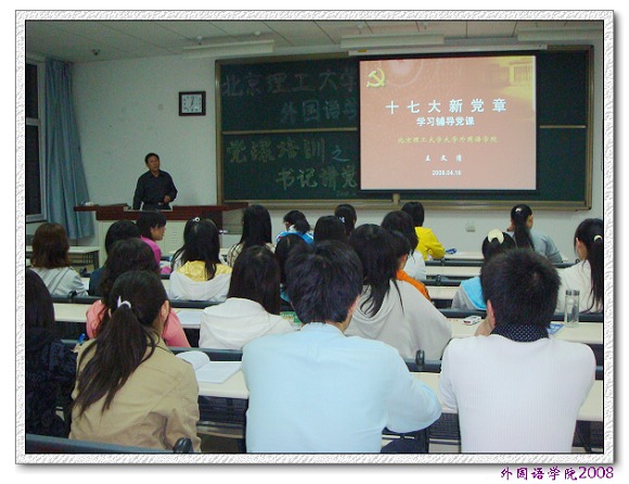 近日,外国语学院2008年新学期第一次党课在理科教学楼109举行,外国语学院党委书记王文清老师为50余名入党积极分子进行题为“十七大新党章学习辅导”的主题党课。此次活动是外国语学院“书记讲党课”系列的第二期。