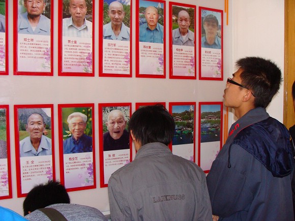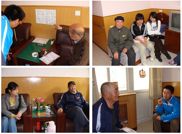 首先,我们被邀至陈列老人照片与优秀事迹的荣臣室进行参观,然后我们分为四个小组,每一组分别与不同的老人进行交流、学习。学习完后,为老人表演节目,同老人进行一些有娱乐活动,最后留影留念。回来之后,同学相互讨论交流,并每人递交一份学习材料。