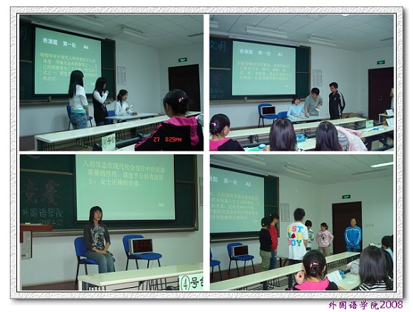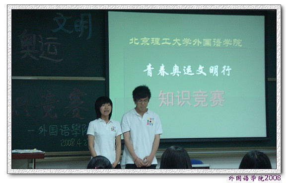 4月27日晚,外国语学院2007级“青春奥运文明行”知识竞赛在良乡校区理科教学楼105隆重举行。宇航学院徐莹莹老师,机车学院李文彪老师,理学院闫磊老师,设计学院毛昭君老师,计算机学院高强老师,外国语学院张磊老师作为嘉宾评委出席此次竞赛。外国语学院2007级共组织6个代表队参加比赛。比赛分为5轮,分别为必答题、抢答题、视频题、表演题、风险题,内容涉及奥林匹克运动历史知识、北京奥运会组织筹备情况、历届奥运会比赛、校园文明礼仪、涉外礼仪等。