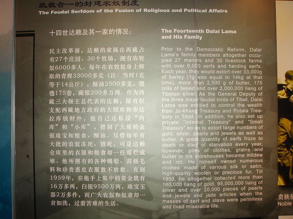 旧西藏实行的农奴制度曾给多少藏族人民带来深重的苦难!展览图片中,有被砍下来的人手,有被农奴主当作祭品的农奴的心脏、肉体和凝固了的血液,还有被农奴主剥下的人皮,其残酷惨烈令人目不忍观。“朱门酒肉臭,路有冻死骨。”当普通农奴人命轻贱到一根草绳便可抵消,95%的藏族人民还在苦苦挣扎在生死边缘之时,十四世达赖却坐拥白银9500万两黄金16万余两,西藏80%的财富掌握仅占人口总数5%的贵族阶层中。在触目惊心的贫富两重天下,是一代代藏民的血泪与控诉。