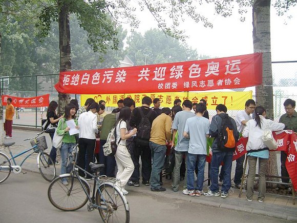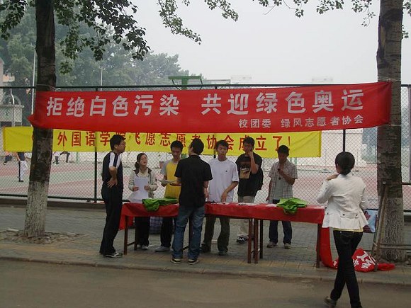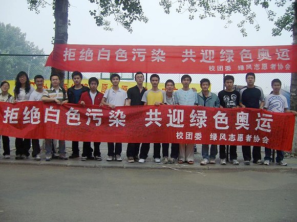 距离奥运会只有八十几天,全国人民都在紧锣密鼓的准备着,共同迎接“绿色奥运”的到来。作为一个志愿者服务性质的团体,我们绿风志愿者协会为2008北京奥运成功举办做着自己的努力。2008年5月16日,绿风志愿者协会在中关村校区组织开展了“拒绝白色污染 共迎绿色奥运”的活动。