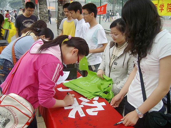 在活动中,我们倡议大家在横幅上签名,以表示自己支持绿色奥运、拒绝白色污染,签名现场异常火爆。