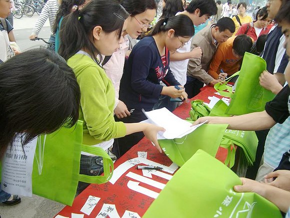 为了不给同学们带来不便并减少塑料袋的使用几率,我们在校团委的支持下订做了近千个环保布袋并无偿发放,使大家能够坚持拒绝白色污染。环保袋漂亮的外观及其特殊的含义立刻吸引了同学们的眼球,活动开始不到一小时,环保袋就发放一空。
