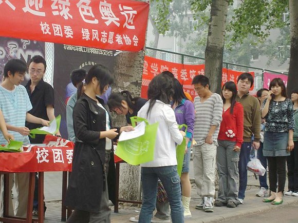 中午11点开始,绿风的成员在新食堂北侧收拾好场地,做好了活动的准备。在我们挂出横幅后,不一会就吸引了好多的同学询问,成员们耐心的讲解白色污染以及其危害的知识,并号召同学们放弃使用塑料袋,为北京奥运贡献自己的一份力量,引起同学们的欢迎。在当时的情景中,我们可以感受到大家为北京奥运努力的热切决心,使我们深受感动。