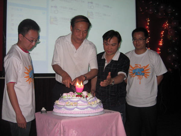 晚会最后,进行了一个温馨而神秘的环节。一部精心制作的祝福片,表达了历届DV人对协会三岁生日的衷心祝福,也唤起了在场观众由衷的感动。影片尾声处,晚会组织者缓缓推出了特意准备的生日蛋糕,由计算机学院、软件学院分党委书记王树武教授和软件学院副书记、副院长陈旵明老师切开了蛋糕。此时此刻,温馨的烛火在特意熄灭了灯光的七号楼报告厅里异常夺目,也为整个晚会画上一个圆满的句号。