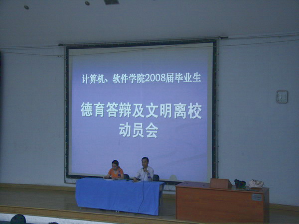 时值盛夏,又一届莘莘学子将带着母校和学院的期望,走出校园,踏上新的人生旅途。6月3日晚7点,在ob真人中新教学楼317教室,计算机、软件学院召开了2008届毕业生德育答辩及文明离校动员会。大会由学院分团委书记胡晓艳老师主持,计算机、软件学院副书记、副院长陈旵明老师出席了大会并作讲话。