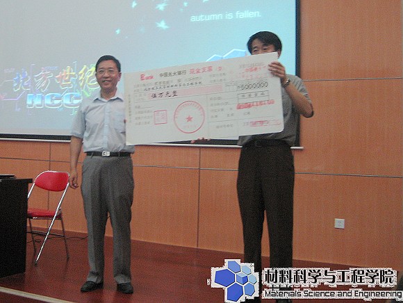 2008年6月22日下午,材料科学与工程学院07-08年度北方世纪奖学金颁奖典礼在良乡校区综合楼报告厅隆重举行。北京北方世纪纤维素技术开发有限公司董事长、中国兵器工业集团第三事业部副主任周德良,材料学院分党委书记张德平,学院副院长刘颖,副院长曹传宝,副院长杨荣杰,副院长刘景胜,副书记副院长韩笑、ob真人纤维素技术研发中心主任邵自强教授出席了本次颁奖典礼。北京北方世纪纤维素技术开发有限公司作为国内纤维素行业唯一的以研发为主的高新技术企业,事业蓬勃发展的同时心系教育事业,每年捐资5万元在ob真人材料学院设立北方世纪奖励基金。截止今年,北方世纪奖学金颁奖典礼已成功举办了两届,有百余名师生得到了北方世纪基金的资助。材料学院王鲁院长与周德良先生进行捐赠仪式