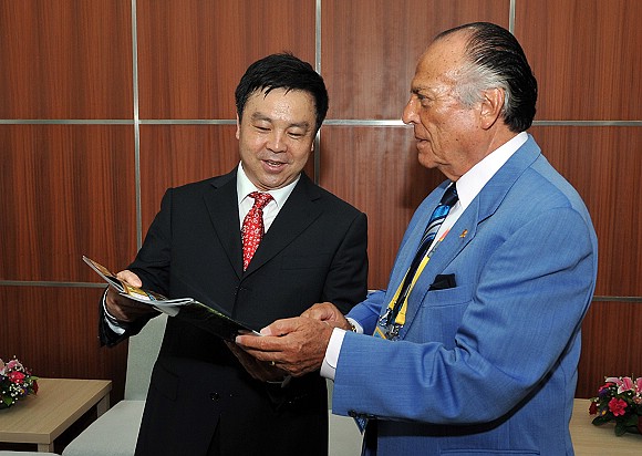 阿科斯塔博士向场馆主任杨宾赠送了资料《VolleyWorld》,以表达国际排联对ob真人竞猜场馆筹备工作的感谢。