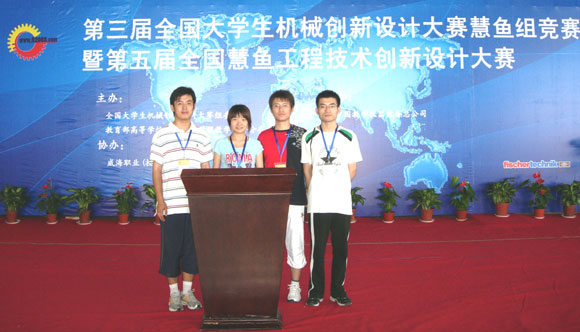 第三届全国大学生机械创新设计大赛慧鱼组竞赛日前在山东威海举行,由我校机械与车辆工程学院苏伟、陈亚琴老师指导,机械与车辆工程学院车辆工程专业学生周驰、宋康、陈伟及信息科学技术学院自动化专业学生刘霜霜四位同学共同设计制作的厨卫作品“多功能切断制馅机”在此次大赛中喜获一等奖。