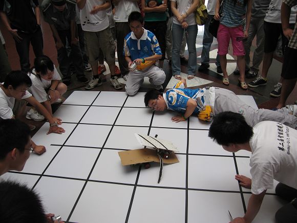 “自控杯”智能控制比赛宗旨在于培养学生的动手能力、创新能力和团队精神。比赛只规定了任务和控制器DSP的型号以及电池型号数量,其它不做任何限制,充分发挥同学的想象力。本次比赛任务分两个阶段。第一阶段是利用DSP控制器控制一个自主移动的机器人过独木桥。第二个阶段非常具有对抗性,比赛时两个队分别从A、B两个区出发,采用攻防战术,先到对方出发区的队为胜者。参赛队伍在10天左右的时间内,根据任务要求进行方案设计,从最基本的元器件入手,设计制作控制电路、检测电路、驱动电路、以及机械传动机构等单元模块。最后构成系统并完成控制算法的设计和编写,撰写了技术报告。