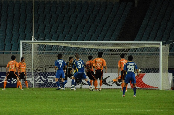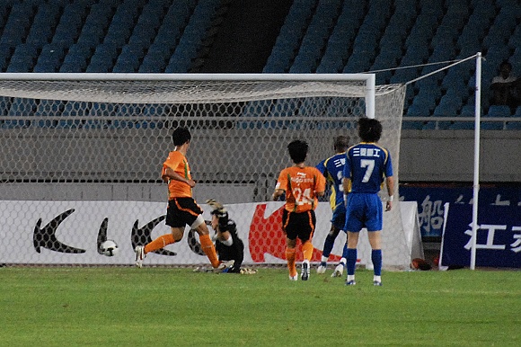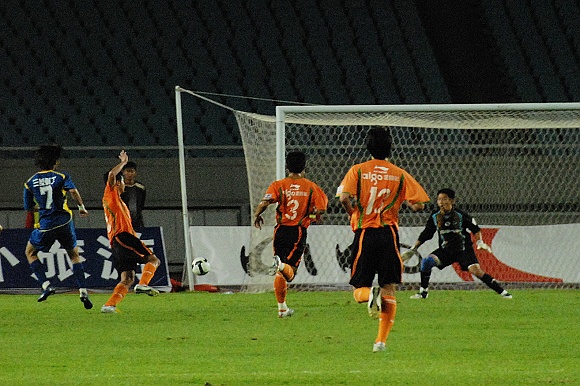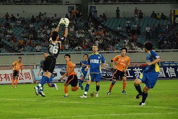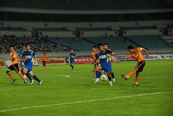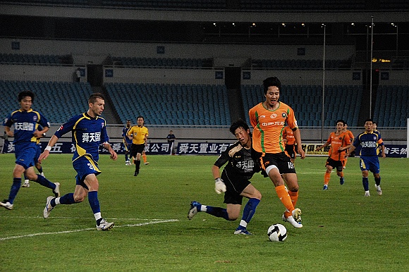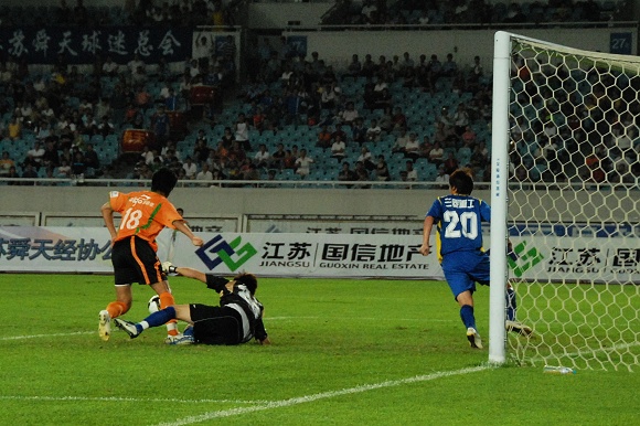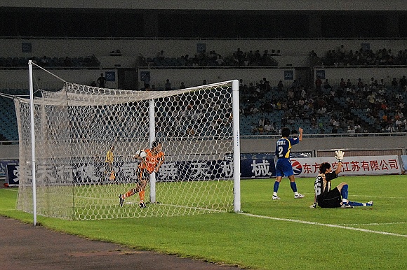 或许是优势来的如此的轻松,让舜天国信队队员多少有些松懈。比赛进行到第32分钟,先是中场传球失误,接着门将关震又贸然出击没能及时回位,杨思源几乎是打了一个空门,1:2。