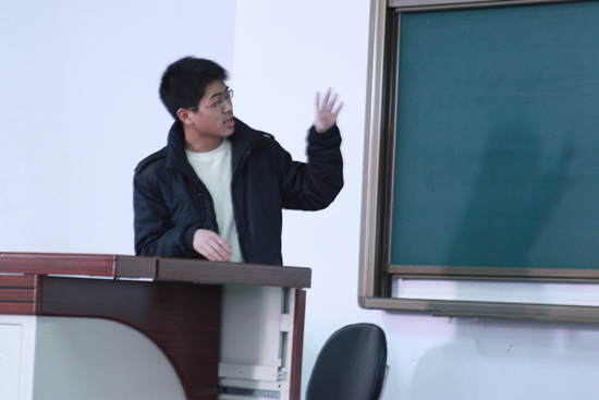 陈杰浩老师向全体学生详细地介绍学院目前关于学生科技创新规划、学生培养方法、目前建设情况、2008年获奖成果、2009年的重点规划。