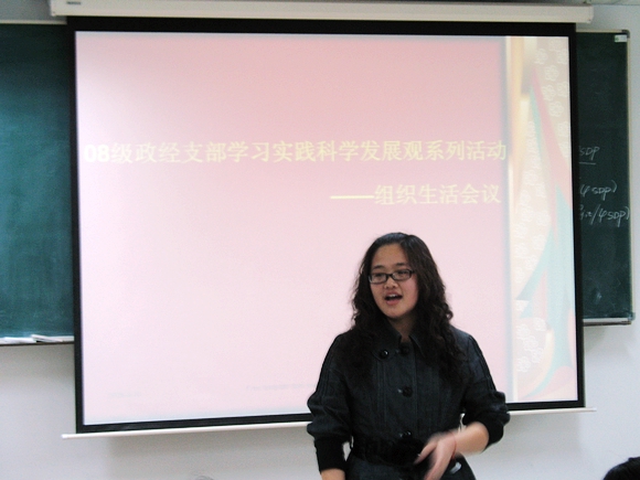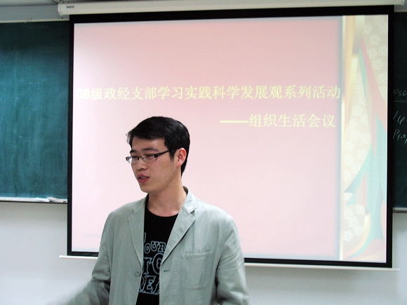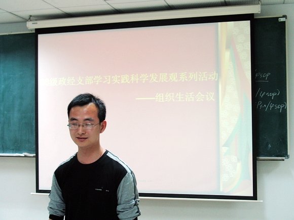 08研政经支部学习实践科学发展观系列活动——组织生活会于4月10日晚9点在研究生教学楼405召开,会议围绕“如何更好地发挥学生党员、学生干部的先锋模范和骨干带头作用及如何加强组织自身建设,更好地服务同学”主题开展。党员、积极分子积极踊跃参加,充分体现了学习实践科学发展观的热情和风貌。