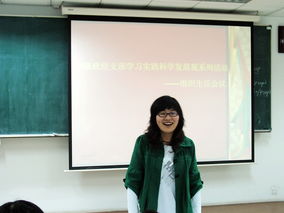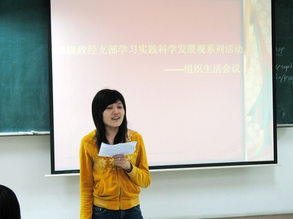 最后支部书记郝霞就同学发言做出总结,并希望同学们将学习实践科学发展观的活动和理念延续下去,用科学理论指导自己实践,不断加强自身建设,用实际行动践行科学发展观要义,同学们积极响应,组织生活会议圆满结束。
