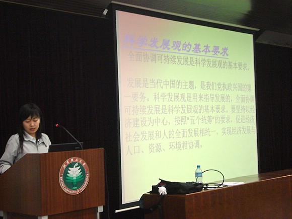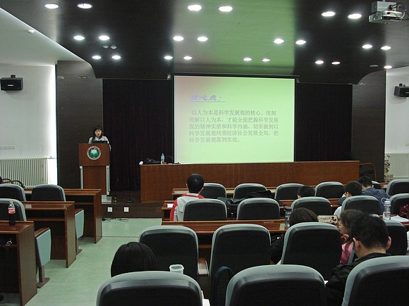 此次党课由管理与经济学院共学会主席范斌同学主讲,研究生和博士生中所有积极向党组织靠拢、递交入党申请且通过上学期考试的学员参加。在本节党课上,范斌同学详细介绍了科学发展观提出的时代背景、基本内容、基本要求、深刻内涵、核心与着眼点以及树立和落实科学发展观的原因、深入贯彻落实科学发展观要注意的若干问题等。