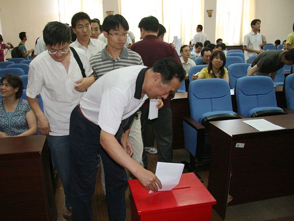 与会代表认真听取了张英书记所作的情况汇报和项昌乐院长所作的针对分析检查报告内容的讲话,认真阅读了投影上显示的《机械与车辆学院领导班子贯彻落实科学发展观情况分析检查报告》,以无记名形式填写了评议表,并在工作人员的监督下顺次投递了评议表。