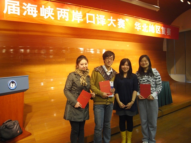 4月17日,“第二届海峡两岸口译大赛”华北区复赛于外研社国际会议中心落下帷幕。在我校外国语学院张渊老师的指导下,2007级英语系李立柏、胡绍聪同学,2009级化学专业研究生李娜同学代表ob真人参加了此次比赛。参赛选手包括来自清华大学,北京外国语大学,对外经贸大学,北京师范大学等知名学府的七十余名英语口译佼佼者。比赛实行分轮淘汰制,选手需进行英译中,中译英和中英对话互译三轮激烈角逐。最终经过激烈的角逐,李立柏同学取得了第十一名的佳绩,荣获华北赛区二等奖。李娜同学荣获华北赛区三等奖,胡绍聪同学荣获优秀奖。