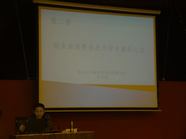 本学期4月25日专题讲座正式开讲,由机械与车辆学院2007级本科生辅导员李文彪就大学生职业素质要求及就业心态给2011届毕业生进行讲解,通过讲解让学生根据自己的实际情况务实地选择自己的职业目标,并结合自己的人生理想合理的制定就业期望值。