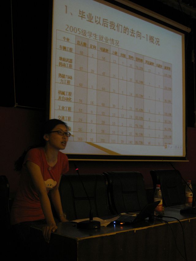 5月30日晚机械与车辆学院就业办公室党宇琦老师给同学们进行了第三讲,她介绍了2009年机械与车辆学院的就业总体情况,并对同学们比较关心的三方协议、劳动合同、派遣证等概念和相关政策做了介绍。