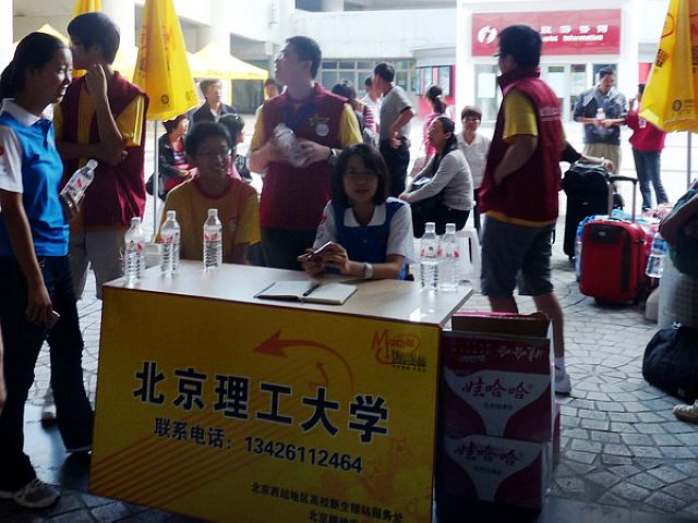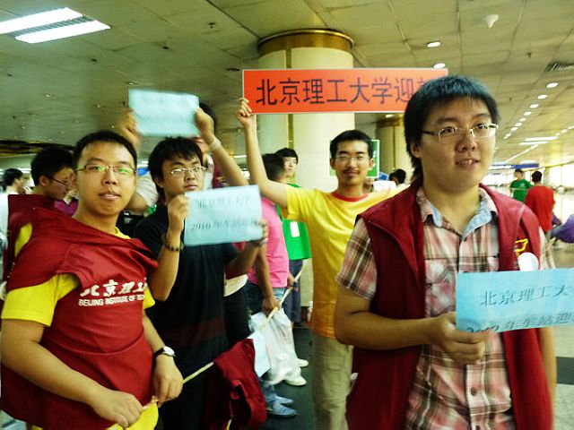 这一天,在火车站的各个出站口,都有身着学校统一服装,手举牌子的理工志愿者。每当有2010级新生到达,志愿者们都会主动帮助学弟学妹提拉行李,并带领学弟学妹登上校车。27日气温很高,尽管汗水浸湿了衣服,但志愿者们仍然十分卖力,有的同学甚至钻进车厢内为新生存放行李;吃饭的时候,他们只能蹲在地上,或是坐在马路边迅速地吃几口,一看到有新生到达,便马上放下手中的盒饭,投入到工作之中。对于这些,志愿者却没有一句怨言,也没有一丝懈怠,因为每个人都表示能尽自己的一份力来帮助学弟学妹们顺利入学,给新生及家长们来京后一个最好的印象,是他们每一个人的希望。而为了当天的迎新工作,所有的志愿者凌晨4点就起床准备,在自己的岗位上一直坚守到了晚上10点最后一班。