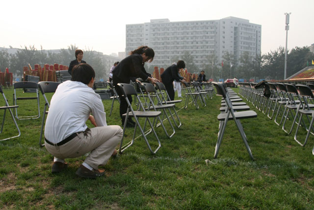 物业服务管理中心在本次校庆活动中承担着艰巨的主会场布置工作。9月24日晚十点,当整个校园渐渐归于宁静,我们物业的员工才开始冲洗校园的每一条街道,默默地工作直至零晨1:30。9月25日清晨,又是我们物业的员工,伴着朝阳出现在即将举行校庆庆典的操场上,这里有11000余把椅子等着他们来摆放。