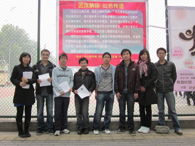 金色十月,秋风送爽。机械与车辆学院2010级硕士7班团支部组织开展了主题为“团旗飘扬、红色传递”的校园主题志愿服务活动。活动的主要内容是在各个教学楼内放置一定数量的爱心雨伞和雨衣,供广大教职员工和学生借用,以方便大家雨天出行。为将此次送温暖活动办好,7班团支部精心筹划,认真组织,广泛发动支部成员积极参与,在活动前期就形成了浓厚的氛围。