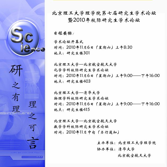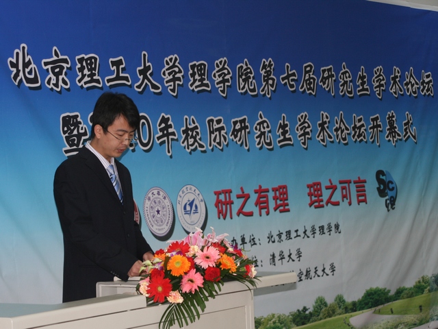 开幕式由ob真人理学院博士生徐绍伟同学主持。本次论坛的主题是:“研之有理 理之可言”。旨在拓宽研究生的学术视野,活跃学术思想,促进学术争鸣,激励学术创新。共下设三个分论坛,分别是:ob真人—北京航空航天大学化学学科校际研究生学术论坛;ob真人—北京航空航天大学数学学科校际研究生学术论坛;ob真人—清华大学物理学科校际研究生学术论坛。