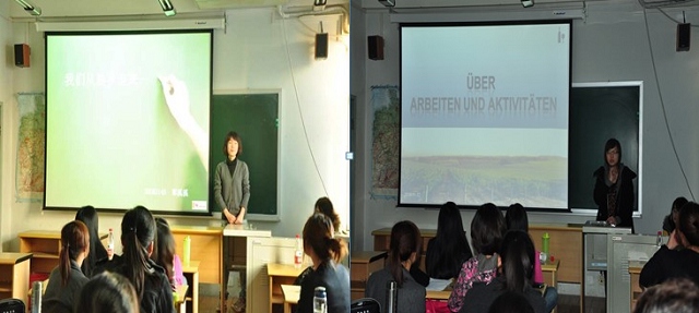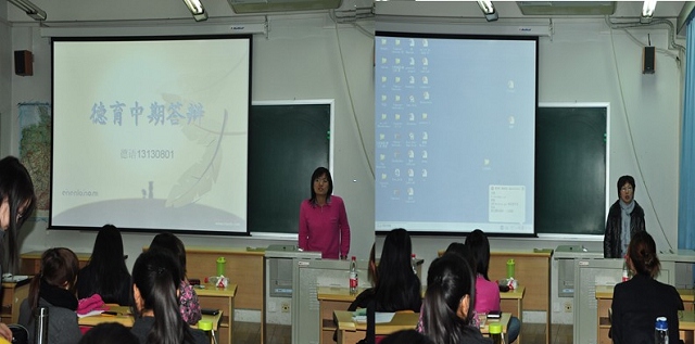 为使广大学生在经过两年的学习后系统、认真地梳理和审视自己两年来的学习生活经历和思想感受,制定好未来的学习目标和规划,2010年11月23日下午13点30分,外国语学院德语系13130801班举行了德育中期答辩报告会。外国语学院党委副书记吴文君,德语系主任姜爱红,2008级导员韩兴杰,13130801班班主任梁珊珊以及授课教师代表李晓宁老师等受邀参加了答辩会。