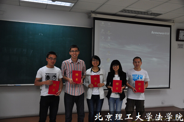 张巍老师首先简单介绍了“司法考试党团小组”和“党团司法考试培训班”主要的工作内容。随后法学院团委书记聂宁宁老师为本次党团小组司法考试培训班的五位班主任颁发聘书,他们分别是2011年“司考桂冠”获得者成绩高出司考线94分的孙彤、08级本科年级第一名涂欣荺、全国自强之星吴拉尔斯、2010年司考最高分获得者陈平、刚刚考取学院研究生的王华堃,由他们将自己成功的司考经验传授给学弟学妹们,对大家的司考备战过程进行全程监督与指导。