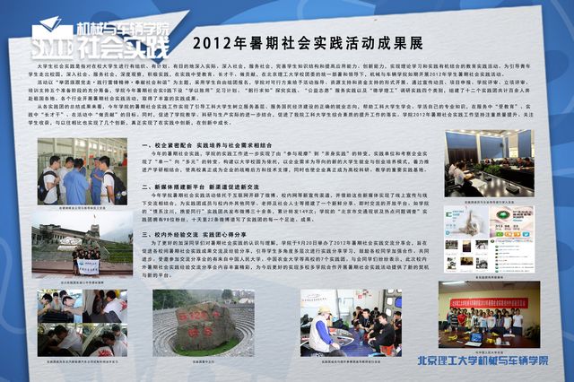 在系列活动的举办过程中,学院还坚持通过喷绘展示等形式进行进一步宣传总结,实践团的成果也汇集成了一本厚厚的成果集宣传册。与此同时,学院还设计完成了学院社会实践工作的形象识别。此次成果汇报会的成功举办标志着机械与车辆学院2012年暑期社会实践工作已圆满完成了主要工作和任务,进入了收尾、总结、积累经验的阶段。