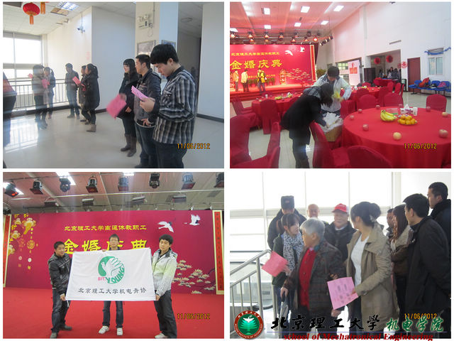 2012年11月6日,学院青年志愿者协会携手09级安全工程团支部,共同参加了我校离退休教职工金婚庆典的志愿服务工作。志愿者们按时高效地完成会场布置,嘉宾引导,协调会场秩序等工作。上午十一点,志愿者们一上午的辛勤工作终于换来了本次金婚庆典的圆满结束。看着老干部们幸福的面庞,志愿者们的心中也同样洋溢着浓浓幸福感,这是奉献自我的幸福、是服务他人的幸福、是以实际行动认真践行雷锋精神所获得的幸福!