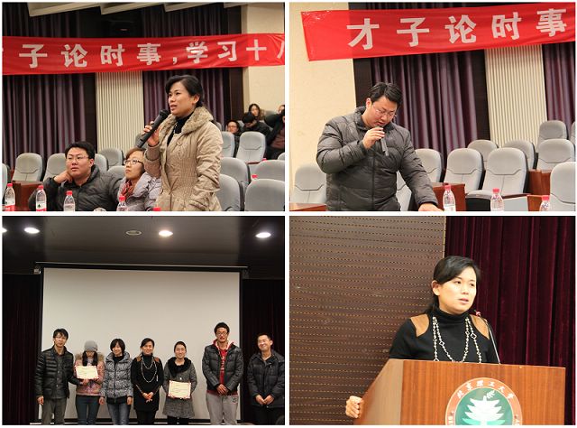 在主持人介绍了比赛的相关规则后,各组参赛队员的主讲人依次上台就各自选择的相关时事的观点一一阐述出来并进行了精彩的评论。首先,王松陈述了对十八大报告中政治体制改革的看法,从政治改革方面为大家详细解读了十八大报告。随后,以高伶俐为主讲人的小组带来了主题为“推进生态文明,建设美丽中国”的演讲,表达了要爱护环境,将建设生态文明放在主要地位的强烈观点。接着,各组成员就钓鱼岛事件,从不同角度加以深度分析。殷子明就争端起因与背景对钓鱼岛事件进行了详细介绍,于本钦通过分析美日对购岛的态度,将坚定钓鱼岛是中国领土的强烈观念展现出来,赵伟将钓鱼岛事件中蕴藏的机遇和挑战一一陈述,赵慧林从战争与和平方面表达了自己对钓鱼岛事件未来发展的看法,最后,王丽娜从地缘政治深切分析了南海问题。在演讲过程中,主讲人对现场观众以及参赛者的提问进行详细解答,对其选题做了进一步的探讨和讲解。