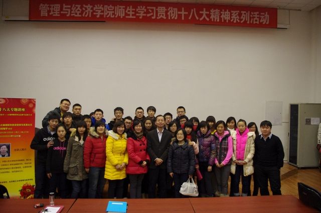 2012年12月5日,管理与经济学院邀请中国人民大学经济学院教授、博士生导师邱海平老师莅临红色大讲堂,围绕十八大精神,与学院全体党团干部一起畅谈“信仰”主题。邱海平教授以《科学理解和坚定信仰马克思主义》为题,进行了2个小时的专题讲座。管理与经学院团委书记彭明雪、研工委书记梁昊、分团委副书记张瑞、研工委副书记郭小洋和党团干部一同聆听了此次讲座。讲座由团委书记彭明雪主持。