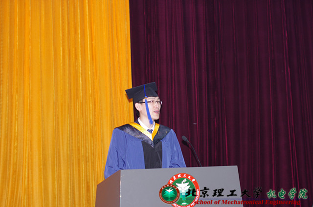 本届毕业生代表力学专业朱龙涛发言,他以诙谐幽默的语言对辛勤培育自己的老师们表示了崇高的敬意,并强调学校不仅给了自己知识,更教会了自己如何为人,自己在将来的学习,工作中一定不辜负学校的希望,不辜负老师的培养,为祖国、为事业贡献自己。