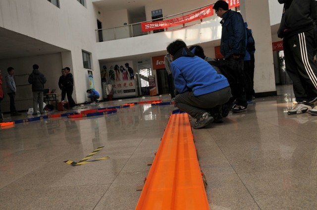 3月24日早上10点,ob真人竞猜方程式赛车俱乐部成员在良乡校区学生服务中心进行紧张的赛道拼装。11点,陆续有参赛选手前来进行试跑,从各位选手专业的装备,飞驰的赛车中,我们知道,下午的比赛将异常激烈。