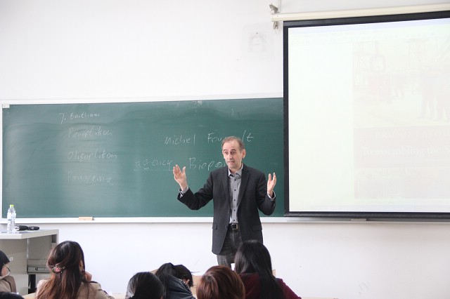 首场报告会于4月17日下午在中心教学楼322进行。在此次报告中,瓦格纳教授结合行为者网络理论(Akteur-Netzwerk-Theorie)对卡夫卡的名著《城堡》进行了一次全新的解读。教授首先介绍了法国社会学家布鲁诺﹒拉图尔(Bruno Latour)的学术名著《Reassembling the Social》,引出行为者网络理论;随后又讲到了汉斯﹒布吕尔(Hans Blüher)的种族理论;在这些社会学的背景知识基础上,瓦格纳教授以独特的视角,结合技术与文化、社会的关系,对《城堡》做出了极富新意的文学解读,引发了师生深刻的思考。