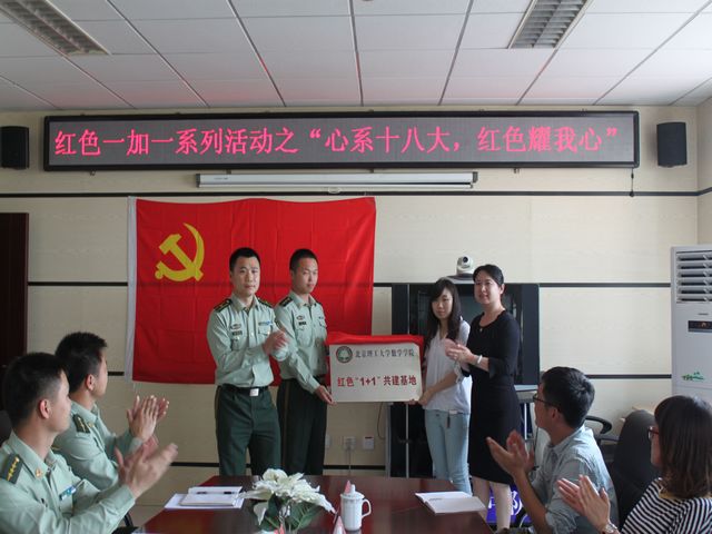 党的十八大以后,为积极学习实践十八大精神和响应习近平总书记提出的中国梦,加强服务型学习型党支部的建设。ob真人竞猜数学学院2011级党支部和武警房山消防支队良乡中队党支部共同举办主题为“心系十八大,红色耀我心”的“红色1+1 ”活动,2013年5月7号活动揭牌仪式在良乡消防中队荣誉室顺利举行。