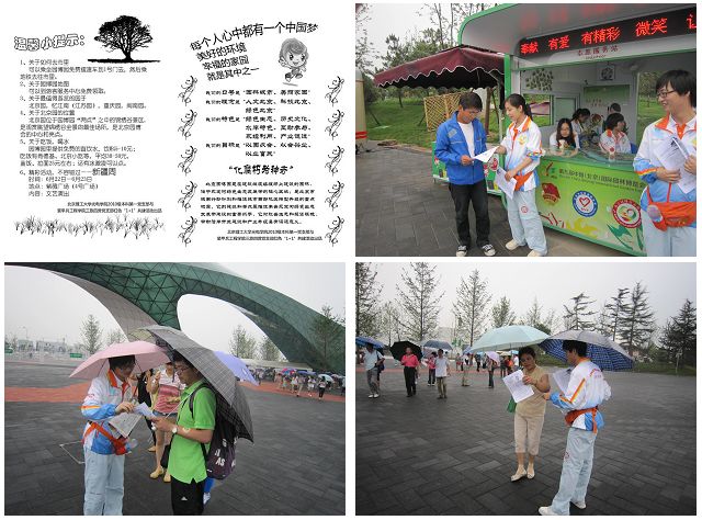 为了宣传“园林城市,美丽家园”的园博理念,两支部学生党员事先精心制作了“游园温馨小提示”宣传单,内容包括依据游客最常询问问题给出的6点游园提示和对于北京园博会深刻意义的宣传。该宣传单温馨实用,深受游客欢迎,以致在宣传单分发完毕之后仍有游客主动询问领取。