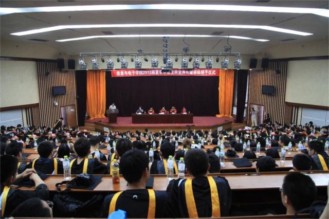 毕业典礼在庄严的国歌声中开始。首先,何遵文副院长宣读了《信息与电子学院2013届优秀毕业生名单》,杨静副院长宣读了《信息与电子学院毕业生各项活动获奖人员及班级名单》。随后进行了毕业生各项活动奖项的颁奖。